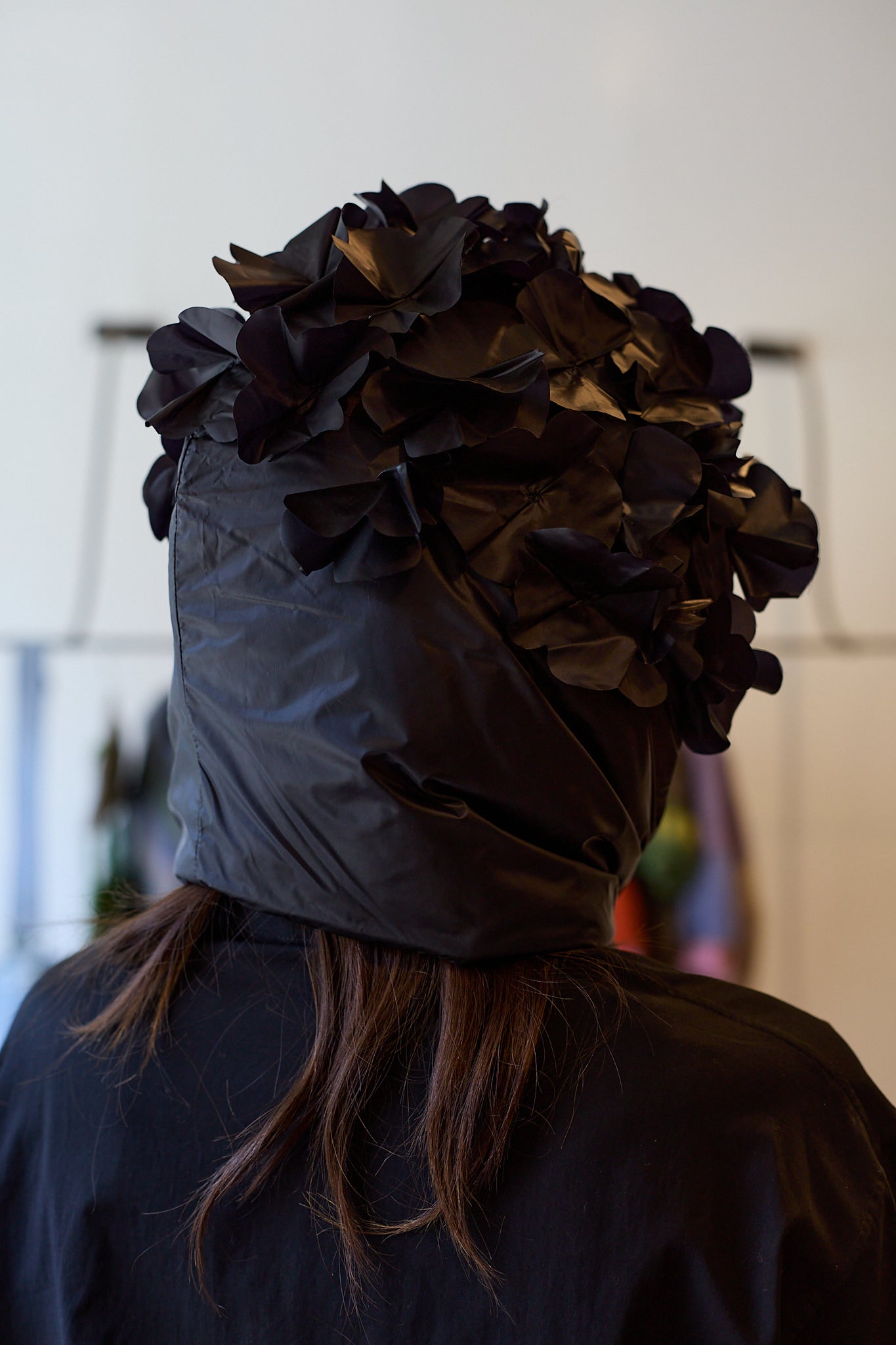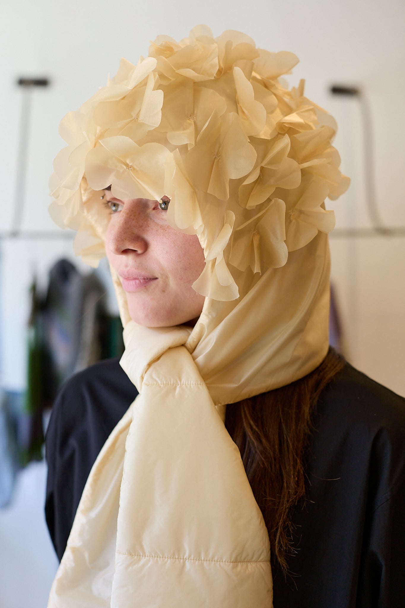 Nylon muffler by Antipast with floral detailing on the hood. Long ends can be tied for extra warmth.