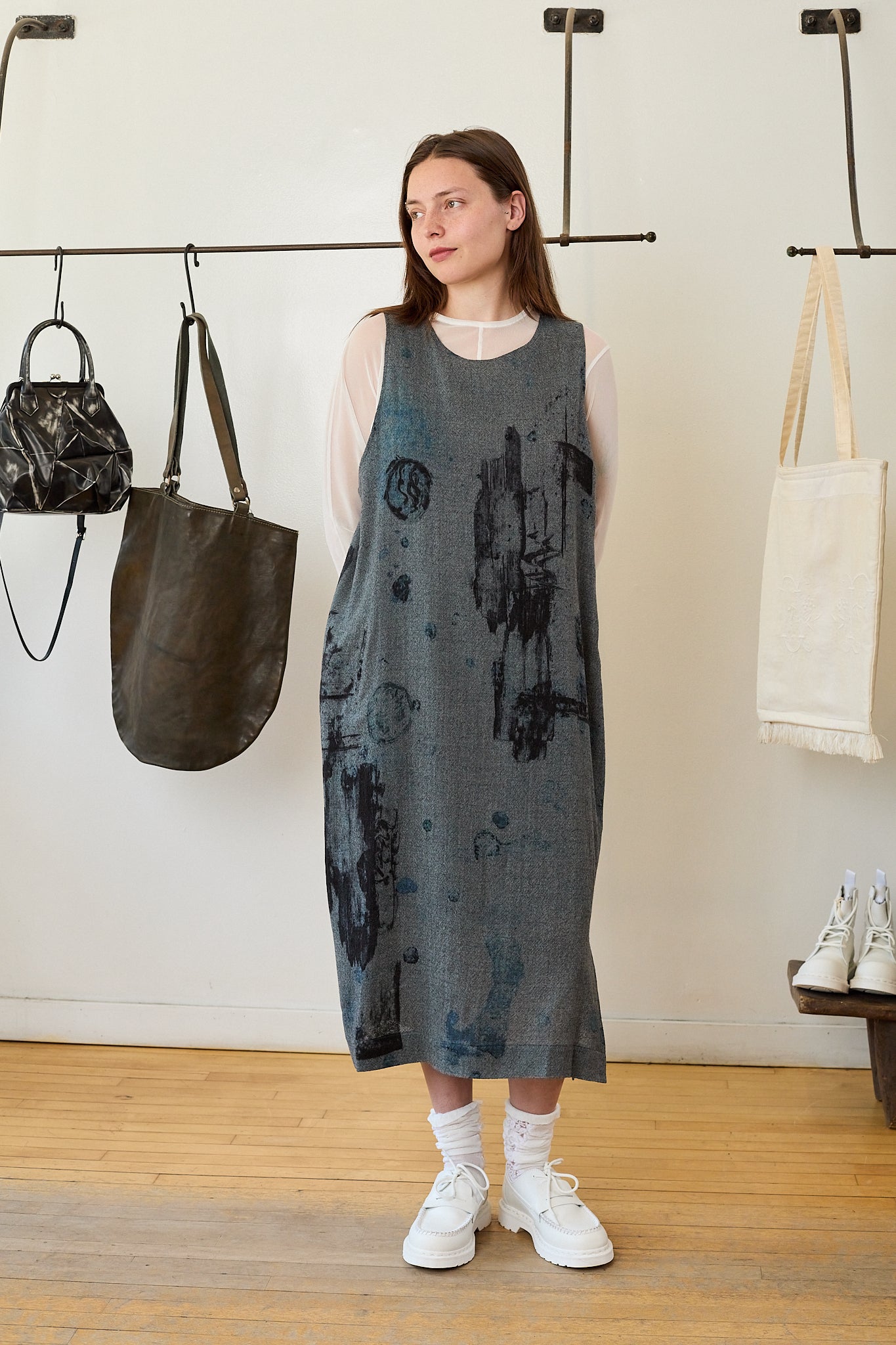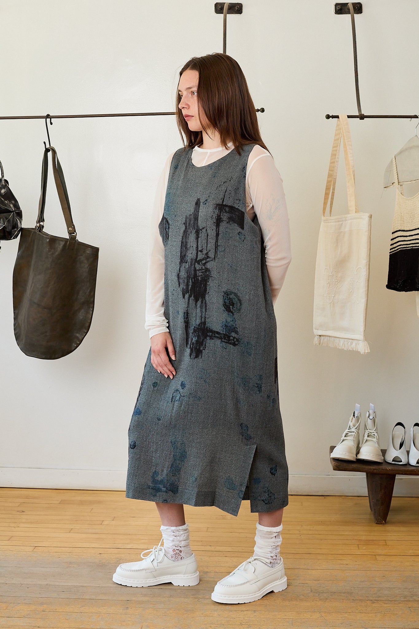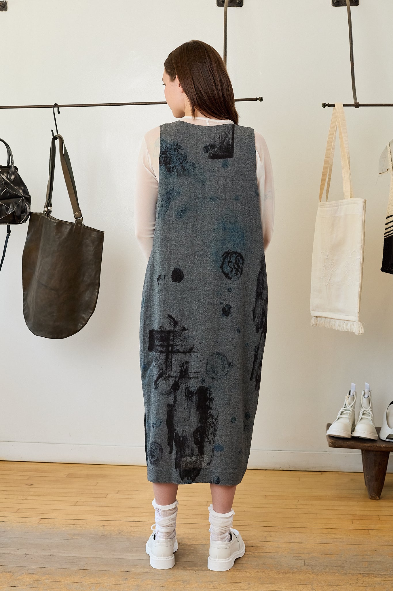 This wool dress features delicate patterns that resemble paintbrush strokes of watercolor. It has an oversized fit and slightly asymmetric armholes, with a vent along the left shin for ease of movement. This dress is a great piece for autumn/winter.